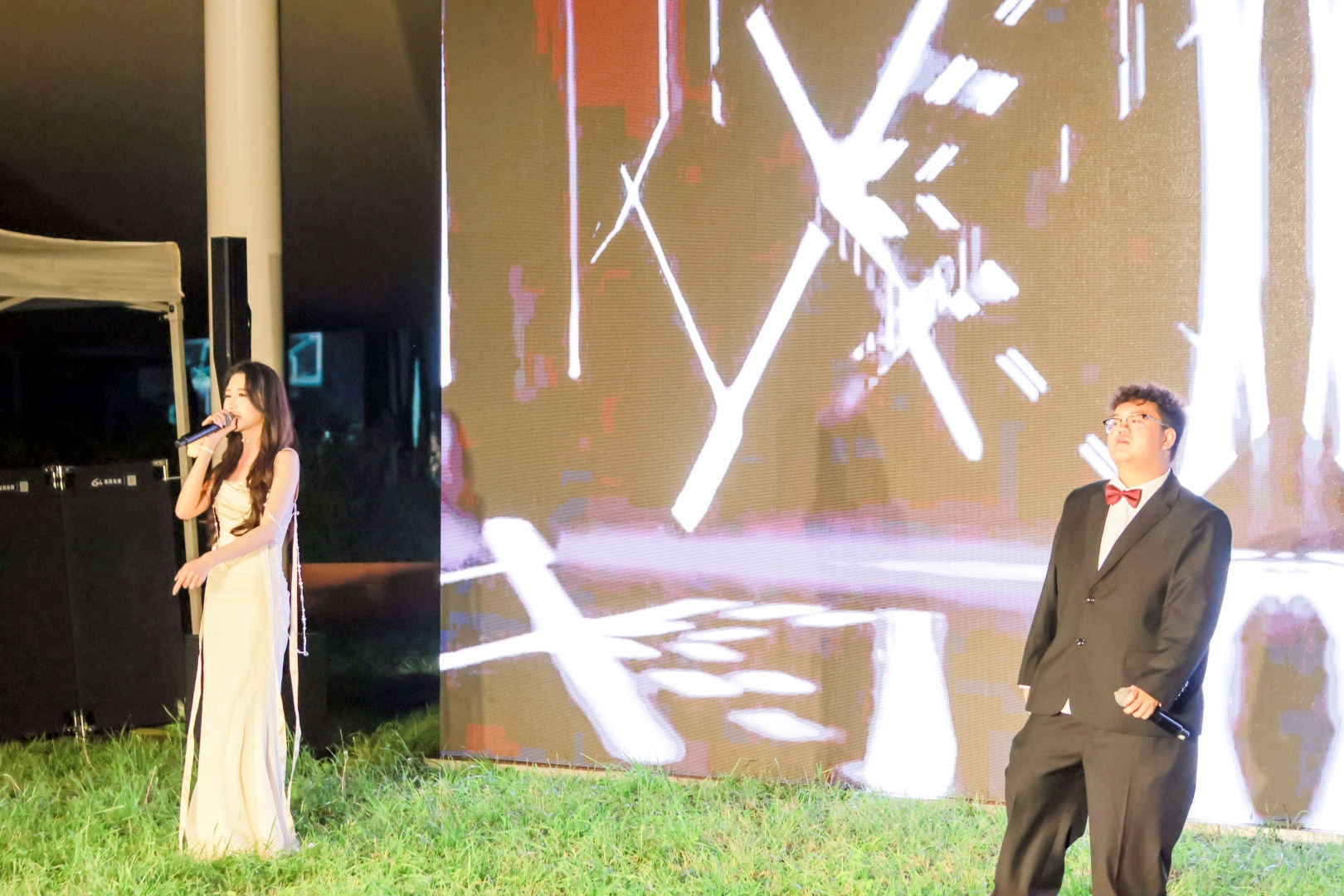 学校专硕国际班学生代表龙挺锋先后带来《Mojito》《小城夏天》歌曲串烧,并同国际教育学院沐雨菡老师惊喜合唱《All Falls Down》。