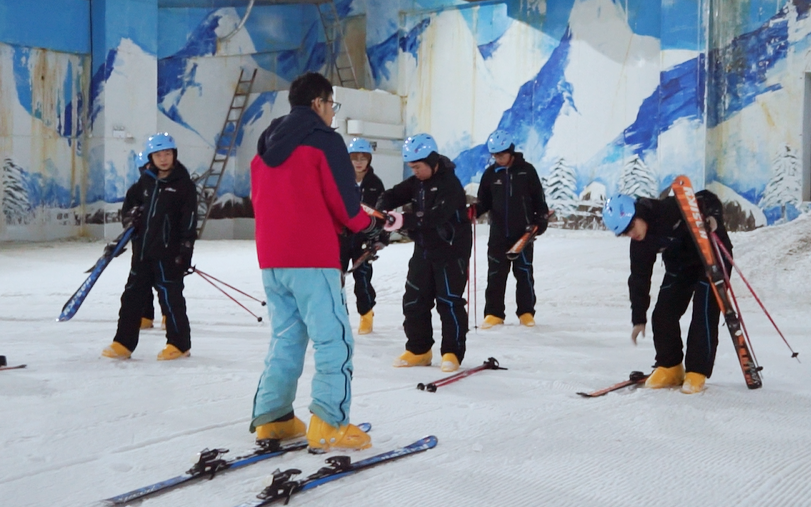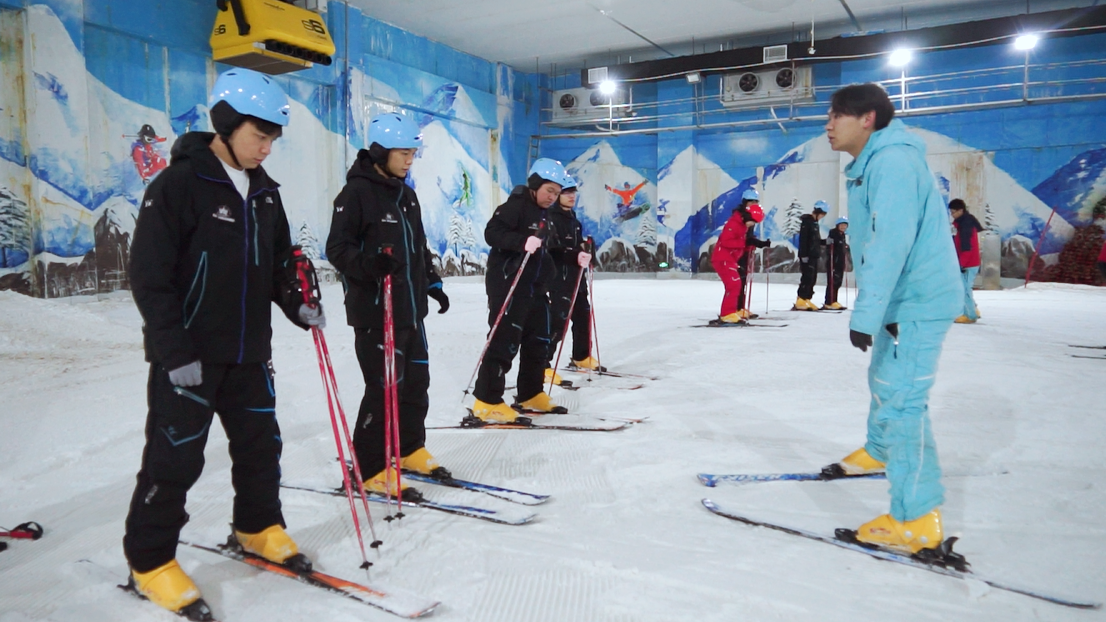 专业教练根据同学们的基础情况进行分组教学,从冰雪运动安全知识讲解入手,逐步引导大家掌握滑雪核心技能。“双脚与肩同宽,膝盖微微弯曲,身体重心稍向前倾,双手紧握滑雪杖置于身体两侧,杖尖轻触雪地……” 教练耐心示范着基础站姿要领,同学们全神贯注地聆听、模仿,认真揣摩每一个动作细节。从正确穿戴雪鞋、雪板等专业装备,到熟悉滑雪器材的使用方法,再到在平坦雪地上尝试稳稳站立,大家循序渐进,在一次次练习中克服紧张与陌生感。