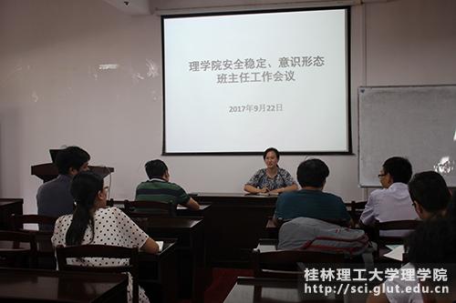 2017年9月22日下午3点,理学院在雁山校区07122召开安全稳定、意识形态班主任工作会议,理学院党委副书记孙巍老师主持,各班班主任和年级辅导员参加。