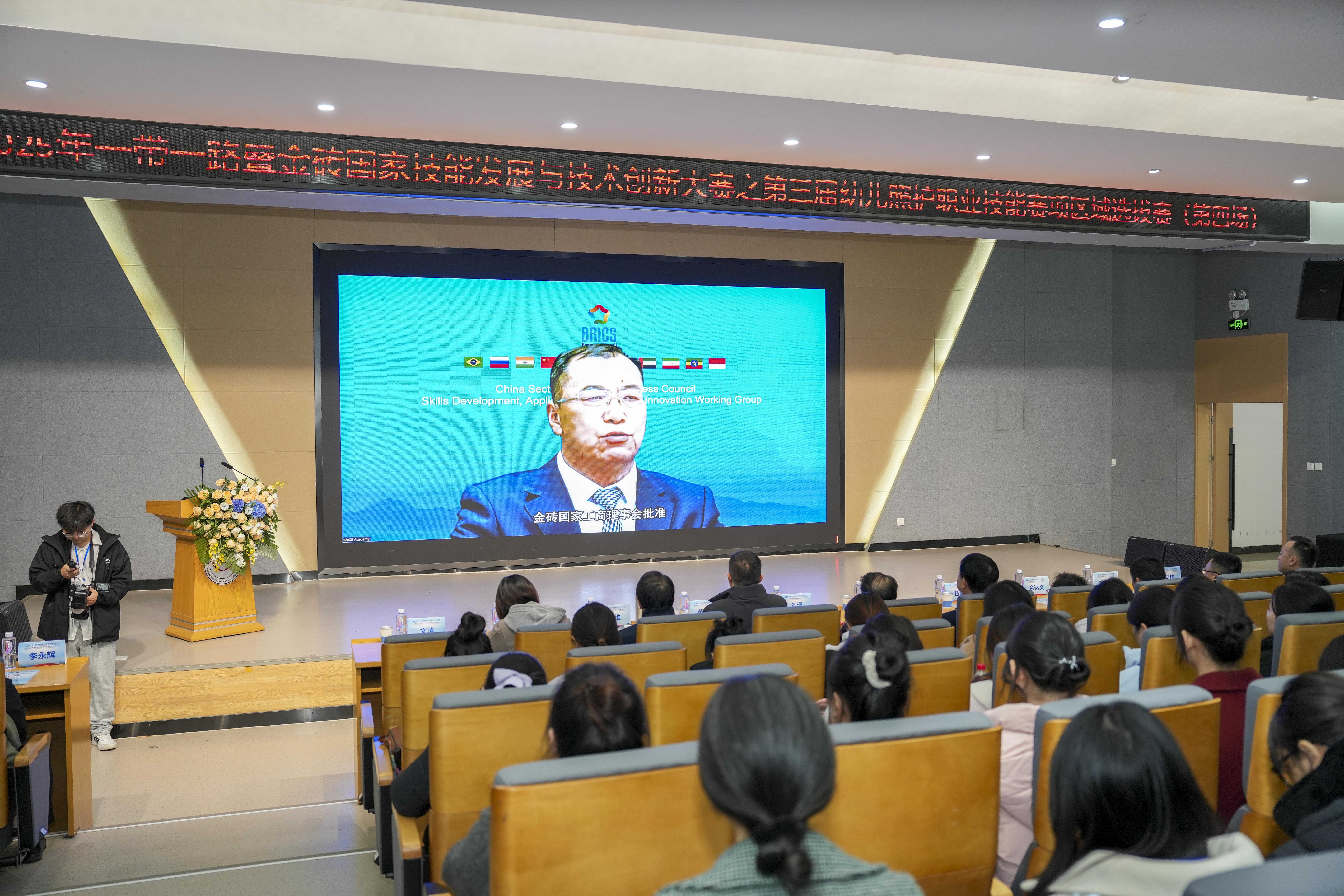 金砖国家技能发展与技术创新大赛组委会执委会主席刘振英博士通过视频讲话。他谈到,幼儿照护技能人才培养是全球民生发展重要课题,赛事既是技能竞技舞台,更为“一带一路”及金砖国家搭建了跨国技术交流与人才成长平台,希望选手们努力拼搏,展现新时代青年的专业风采与奋进姿态。