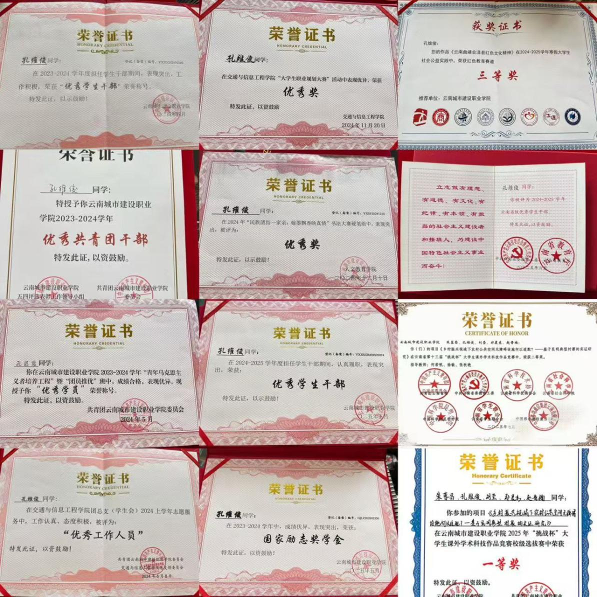 2025年:先后获得国家励志奖学金、省(校)级“优秀学生干部”、云南省第十三届“挑战杯”大学生课外学术科技作品竞赛校级“一等奖”和省级“二等奖”、校级寒假大学生社会公益实践活动“三等奖”等荣誉。